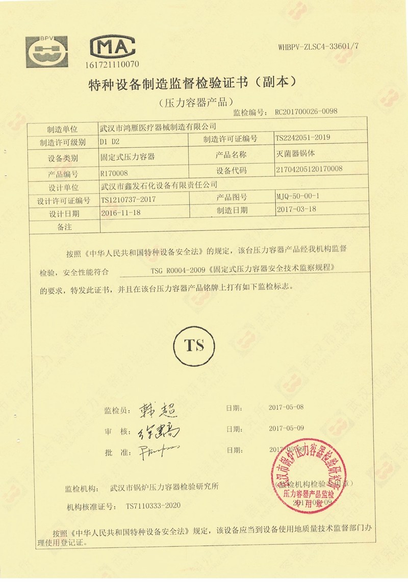 武漢市鴻雁醫療器械制造有限公司主要從事醫療器械、各規格壓力蒸氣滅菌器以及食品、環保等設備的制造。公司產品受鍋爐壓力容器檢驗研究院和食品藥品監督管理局雙重監檢,每臺設備均有自己的身份銘牌。公司始終不渝地堅持科技興企、科學管理的方針,重視科技進步為企業帶來的機會和效益,努力將新技術成果轉化為產業優勢,秉持以品質穩定、產品革新、客戶滿意為公司宗旨。與客戶共創雙贏的局面,分享各項成果,回饋社會。